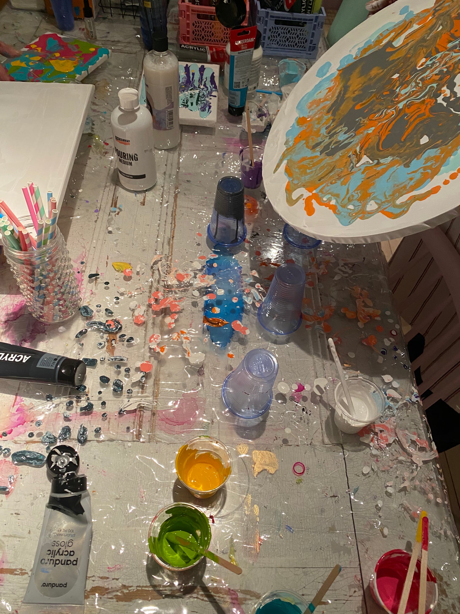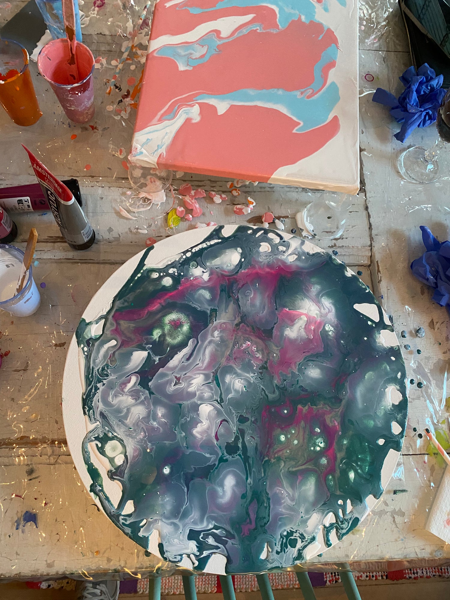 Let it Flow -maalauspaja toteutetaan akryylikaatona, jolla saa aikaan upeita abstrakteja tauluja. Maalauspaja on kaikille avoin tapahtuma. Tarkista tulevat workshopit verkkokaupasta tai somesta. Tule mukaan kokeilemaan akryylikaatoa ja toteuta kaunis marmorinen teos maalauspohjalle. Sinulla ei tarvitse olla aiempaa kokemusta maalaamisesta, voit olla ensikertalainen tai jo kokenut tekijä - pääasia on viettää mukava taidehetki yksin tai kaverin kanssa. Ikäraja K18.