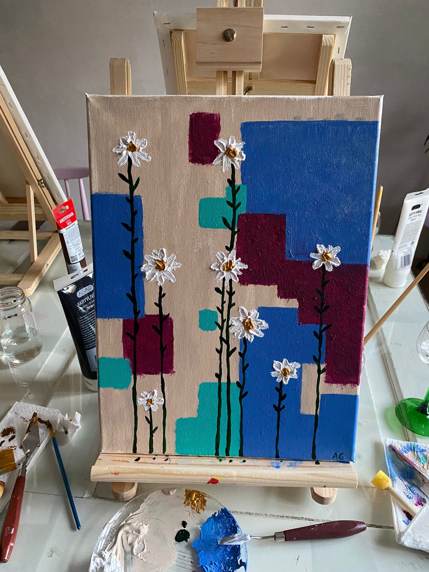 Mitä siel tehdää? Taulut maalataan akryylimaaleilla 30x40 cm canvaalle, voit hyödyntää akryylivärien ja siveltimien lisäksi mm. tekstuurimassaa ja palettiveitsiä.