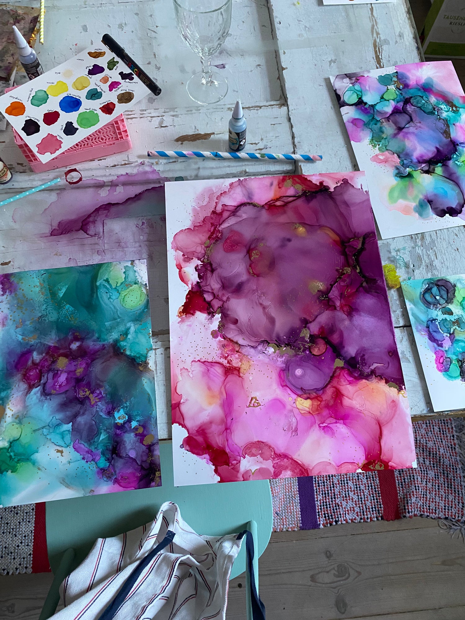 Mitä siel tehdää? Alkoholimusteet tekevät suurimman työn puolestasi, joten voit keskittyä illasta ja tunnelmasta nauttimiseen. Sinulla on käytössä kaksi A3-kokoista alkoholimustepaperia, joita voidaan leikata pienempiin paloihin.
