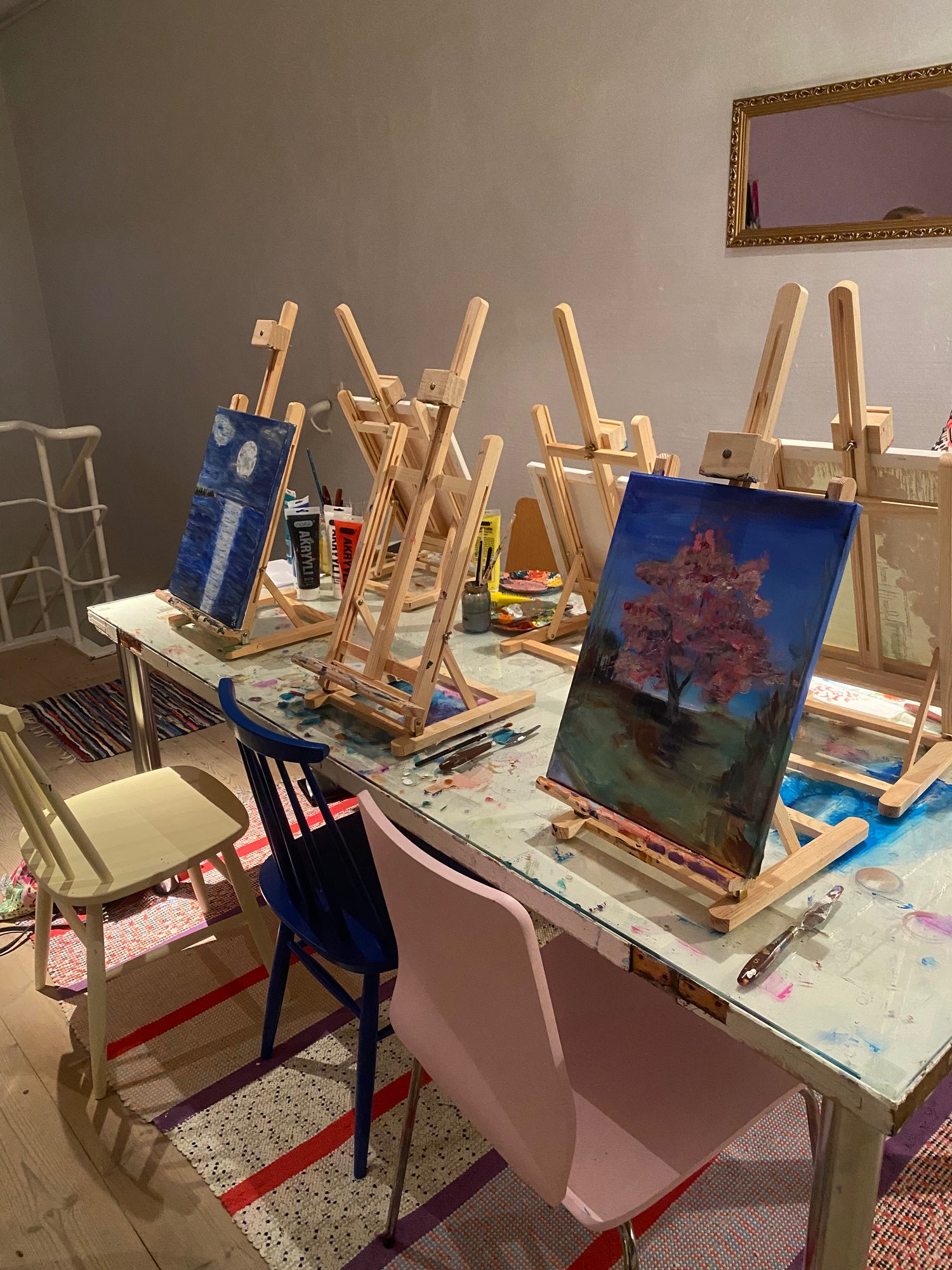 - Hinta määräytyy ryhmäkoon mukaan. Maalauspaja 37€/hlö ja alkoholimuste 43€/hlö. Hinta sisältää tarvikkeet ja ohjaukset. Juomat ovat omakustanteiset.